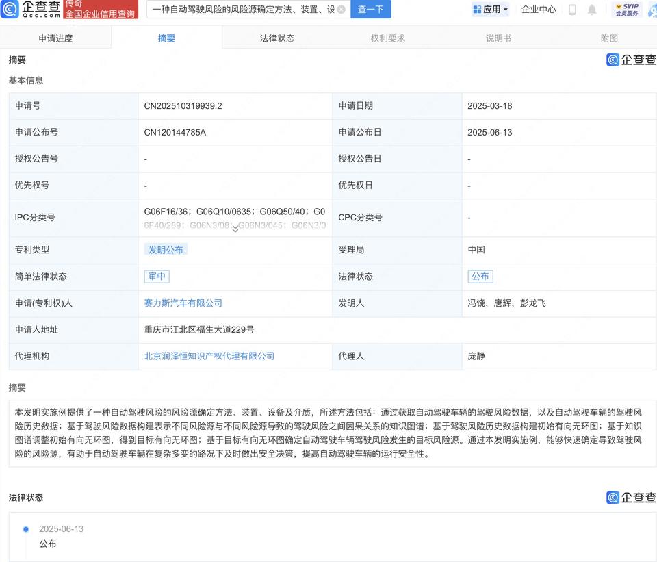 企查查APP显示,近日,赛力斯汽车有限公司申请的“一种自动驾驶风险的风险源确定方法、装置、设备及介质”专利公布。企查查专利摘要显示,通过本发明实施例,能够快速确定导致驾驶风险的风险源,有助于自动驾驶车辆在复杂多变的路况下及时做出安全决策,提高自动驾驶车辆的运行安全性。
